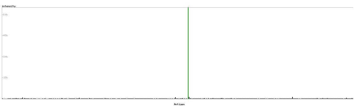 At the top of the view, the position of the antigen (identified by the corresponding HPA identifier) is shown as a green bar. A yellow triangle on the bar indicates a <100% sequence identity to the protein target.