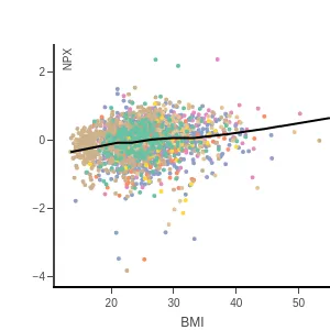 Blood protein levels by age, BMI, and sex, measured using the proximity extension assay (PEA) with the Olink Explore 1536. In the age and sex scatterplots, samples are colored by disease class.