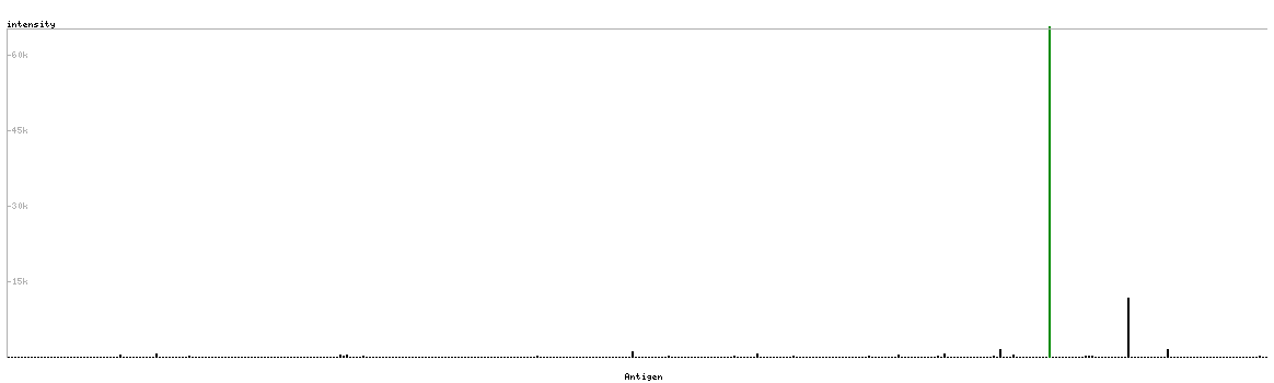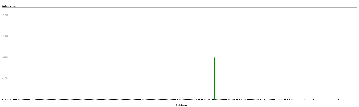 At the top of the view, the position of the antigen (identified by the corresponding HPA identifier) is shown as a green bar. A yellow triangle on the bar indicates a <100% sequence identity to the protein target.