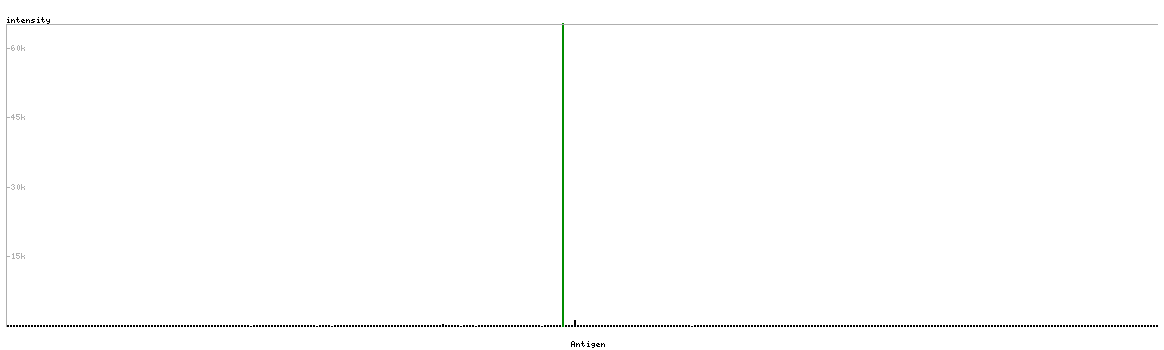 At the top of the view, the position of the antigen (identified by the corresponding HPA identifier) is shown as a green bar. A yellow triangle on the bar indicates a <100% sequence identity to the protein target.