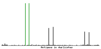 At the top of the view, the position of the antigen (identified by the corresponding HPA identifier) is shown as a green bar. A yellow triangle on the bar indicates a <100% sequence identity to the protein target.