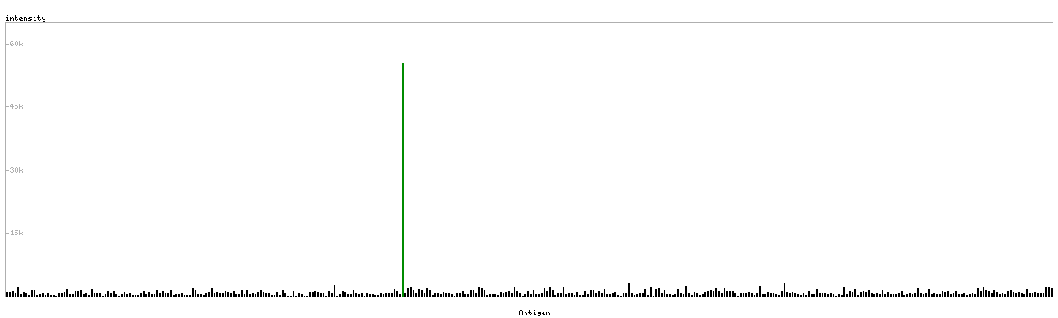 At the top of the view, the position of the antigen (identified by the corresponding HPA identifier) is shown as a green bar. A yellow triangle on the bar indicates a <100% sequence identity to the protein target.