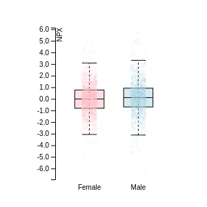 Blood protein levels in 96 healthy adults (aged 50–65) measured at six visits over a two-year period, shown separately for males and females. Relative protein abundances were quantified using the proximity extension assay (PEA) with the Olink Explore HT.