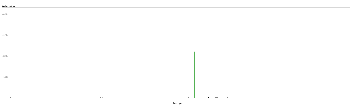 At the top of the view, the position of the antigen (identified by the corresponding HPA identifier) is shown as a green bar. A yellow triangle on the bar indicates a <100% sequence identity to the protein target.