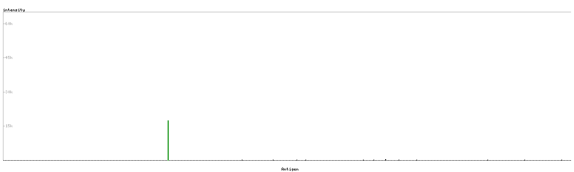 At the top of the view, the position of the antigen (identified by the corresponding HPA identifier) is shown as a green bar. A yellow triangle on the bar indicates a <100% sequence identity to the protein target.