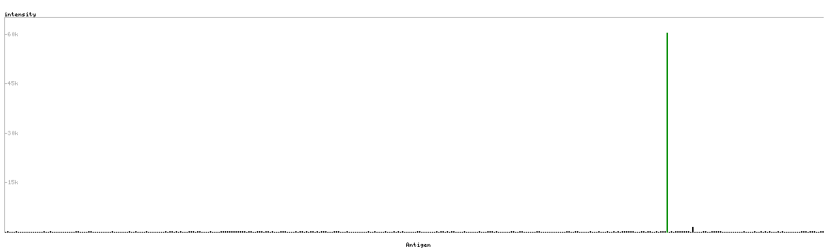 At the top of the view, the position of the antigen (identified by the corresponding HPA identifier) is shown as a green bar. A yellow triangle on the bar indicates a <100% sequence identity to the protein target.