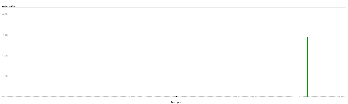 At the top of the view, the position of the antigen (identified by the corresponding HPA identifier) is shown as a green bar. A yellow triangle on the bar indicates a <100% sequence identity to the protein target.