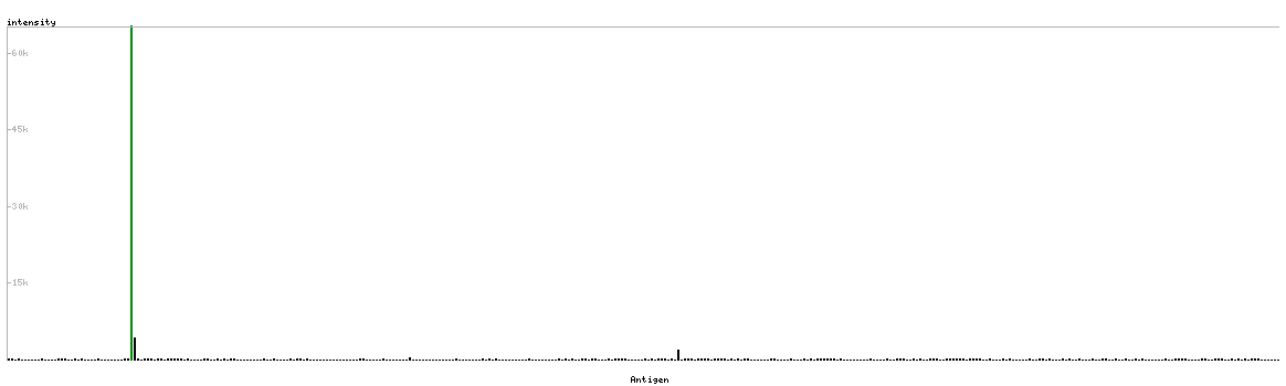 At the top of the view, the position of the antigen (identified by the corresponding HPA identifier) is shown as a green bar. A yellow triangle on the bar indicates a <100% sequence identity to the protein target.