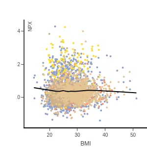 Blood protein levels by age, BMI, and sex, measured using the proximity extension assay (PEA) with the Olink Explore 1536. In the age and sex scatterplots, samples are colored by disease class.