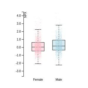 Blood protein levels in 96 healthy adults (aged 50–65) measured at six visits over a two-year period, shown separately for males and females. Relative protein abundances were quantified using the proximity extension assay (PEA) with the Olink Explore HT.