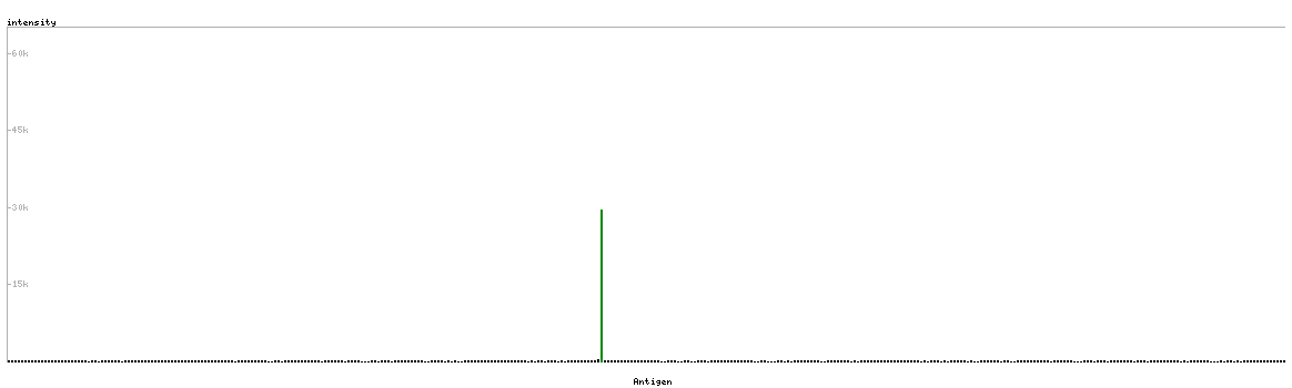 At the top of the view, the position of the antigen (identified by the corresponding HPA identifier) is shown as a green bar. A yellow triangle on the bar indicates a <100% sequence identity to the protein target.