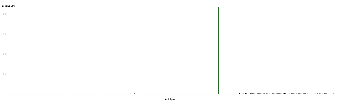 At the top of the view, the position of the antigen (identified by the corresponding HPA identifier) is shown as a green bar. A yellow triangle on the bar indicates a <100% sequence identity to the protein target.