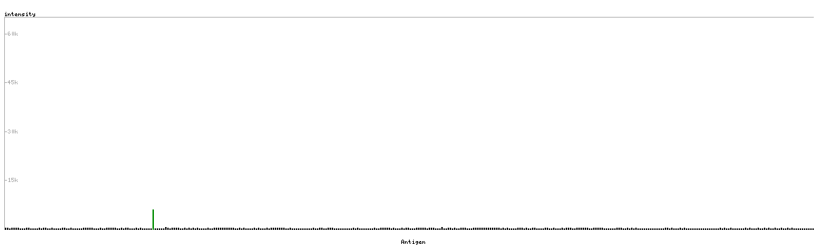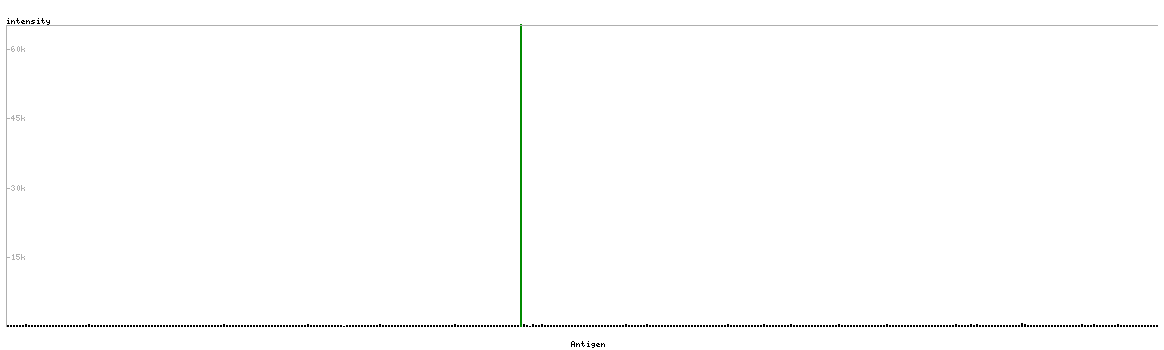 At the top of the view, the position of the antigen (identified by the corresponding HPA identifier) is shown as a green bar. A yellow triangle on the bar indicates a <100% sequence identity to the protein target.