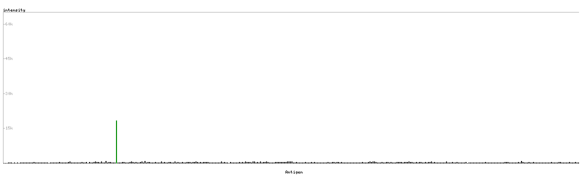 At the top of the view, the position of the antigen (identified by the corresponding HPA identifier) is shown as a green bar. A yellow triangle on the bar indicates a <100% sequence identity to the protein target.