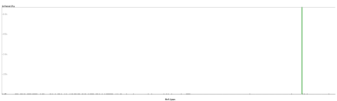 At the top of the view, the position of the antigen (identified by the corresponding HPA identifier) is shown as a green bar. A yellow triangle on the bar indicates a <100% sequence identity to the protein target.