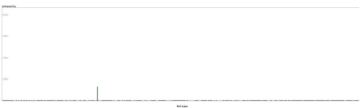 At the top of the view, the position of the antigen (identified by the corresponding HPA identifier) is shown as a green bar. A yellow triangle on the bar indicates a <100% sequence identity to the protein target.