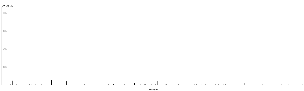 At the top of the view, the position of the antigen (identified by the corresponding HPA identifier) is shown as a green bar. A yellow triangle on the bar indicates a <100% sequence identity to the protein target.