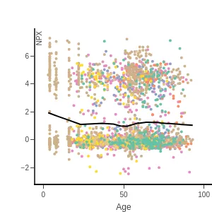 Blood protein levels by age, BMI, and sex, measured using the proximity extension assay (PEA) with the Olink Explore 1536. In the age and sex scatterplots, samples are colored by disease class.