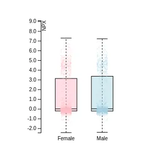 Blood protein levels in 96 healthy adults (aged 50–65) measured at six visits over a two-year period, shown separately for males and females. Relative protein abundances were quantified using the proximity extension assay (PEA) with the Olink Explore HT.