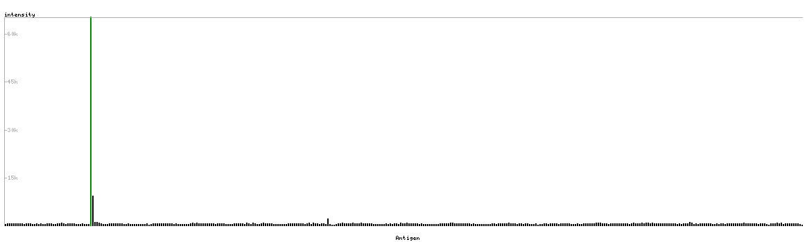 At the top of the view, the position of the antigen (identified by the corresponding HPA identifier) is shown as a green bar. A yellow triangle on the bar indicates a <100% sequence identity to the protein target.