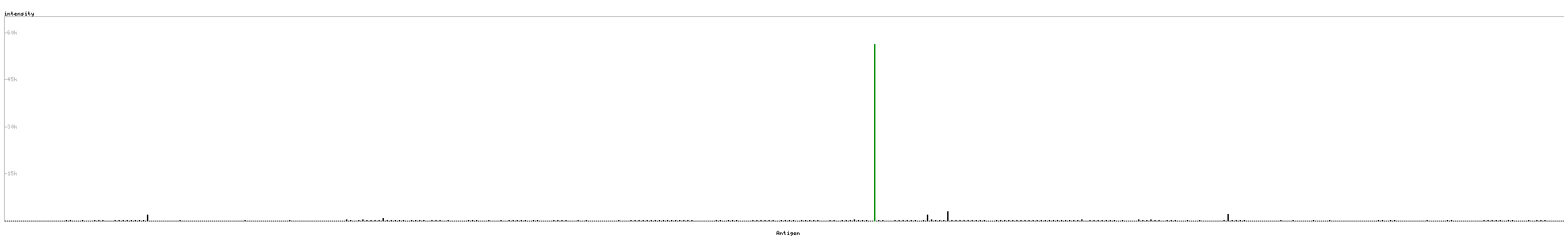 At the top of the view, the position of the antigen (identified by the corresponding HPA identifier) is shown as a green bar. A yellow triangle on the bar indicates a <100% sequence identity to the protein target.