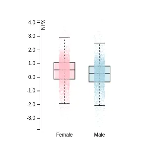 A gene is classified as upregulated in a disease if the average concentration of all samples of that disease is significantly higher (adj P-value<0.005 and NPX difference>=1) than the average concentration of samples of all diseases as measured by PEA . For gender specific diseases the analysis includes only samples corresponding to the same gender from the other diseases.
