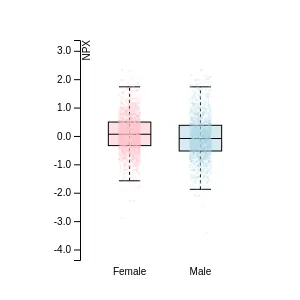 Blood protein levels in 96 healthy adults (aged 50–65) measured at six visits over a two-year period, shown separately for males and females. Relative protein abundances were quantified using the proximity extension assay (PEA) with the Olink Explore HT.