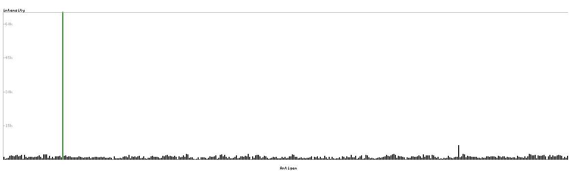 At the top of the view, the position of the antigen (identified by the corresponding HPA identifier) is shown as a green bar. A yellow triangle on the bar indicates a <100% sequence identity to the protein target.