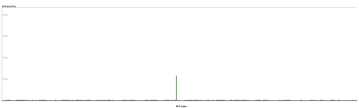 At the top of the view, the position of the antigen (identified by the corresponding HPA identifier) is shown as a green bar. A yellow triangle on the bar indicates a <100% sequence identity to the protein target.