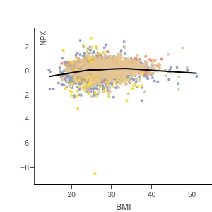 Blood protein levels by age, BMI, and sex, measured using the proximity extension assay (PEA) with the Olink Explore 1536. In the age and sex scatterplots, samples are colored by disease class.