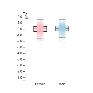 Blood protein levels in 96 healthy adults (aged 50–65) measured at six visits over a two-year period, shown separately for males and females. Relative protein abundances were quantified using the proximity extension assay (PEA) with the Olink Explore HT.