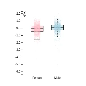 A gene is classified as upregulated in a disease if the average concentration of all samples of that disease is significantly higher (adj P-value<0.005 and NPX difference>=1) than the average concentration of samples of all diseases as measured by PEA . For gender specific diseases the analysis includes only samples corresponding to the same gender from the other diseases.