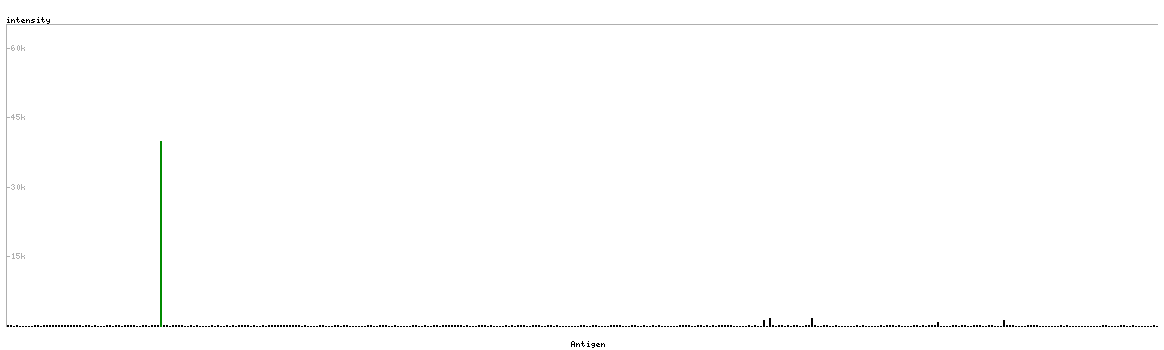 At the top of the view, the position of the antigen (identified by the corresponding HPA identifier) is shown as a green bar. A yellow triangle on the bar indicates a <100% sequence identity to the protein target.