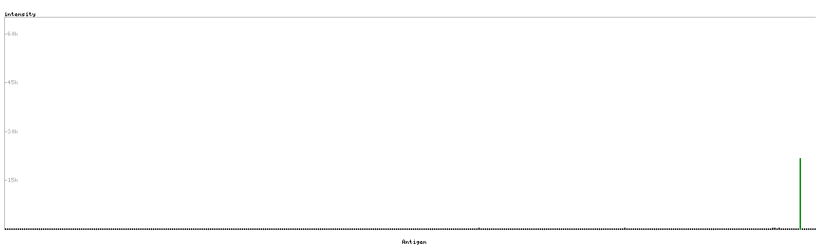 At the top of the view, the position of the antigen (identified by the corresponding HPA identifier) is shown as a green bar. A yellow triangle on the bar indicates a <100% sequence identity to the protein target.