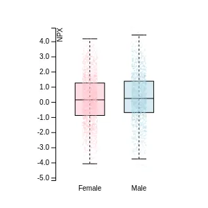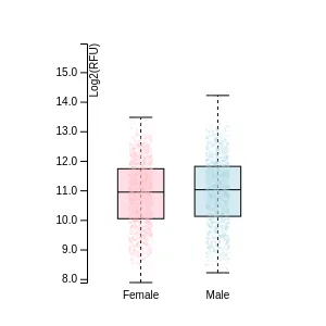 Blood protein levels in 96 healthy adults (aged 50–65) measured at six visits over a two-year period, shown separately for males and females. Relative protein abundances were quantified using the proximity extension assay (PEA) with the Olink Explore HT.
