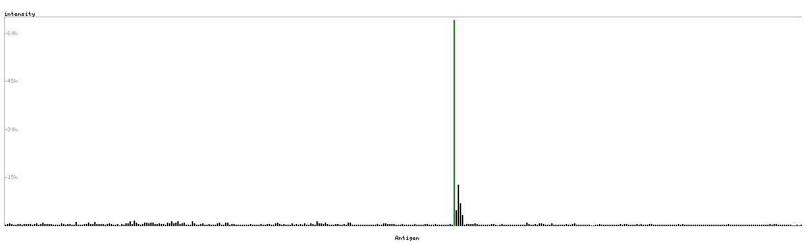 At the top of the view, the position of the antigen (identified by the corresponding HPA identifier) is shown as a green bar. A yellow triangle on the bar indicates a <100% sequence identity to the protein target.