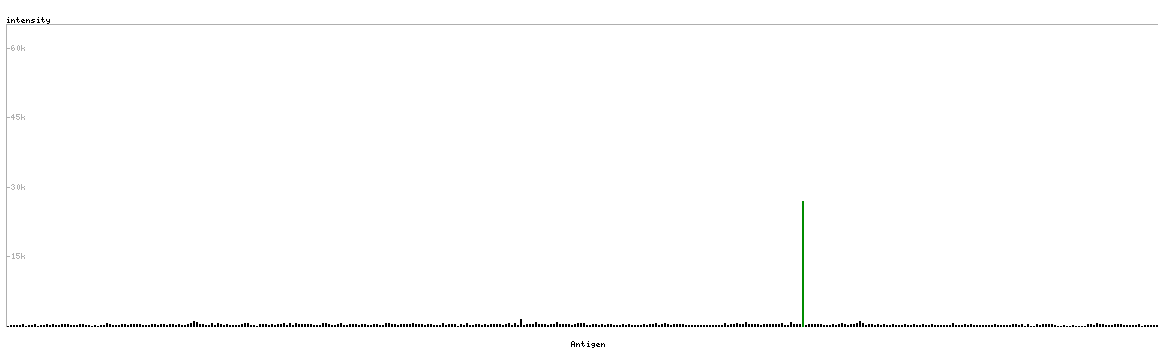 At the top of the view, the position of the antigen (identified by the corresponding HPA identifier) is shown as a green bar. A yellow triangle on the bar indicates a <100% sequence identity to the protein target.
