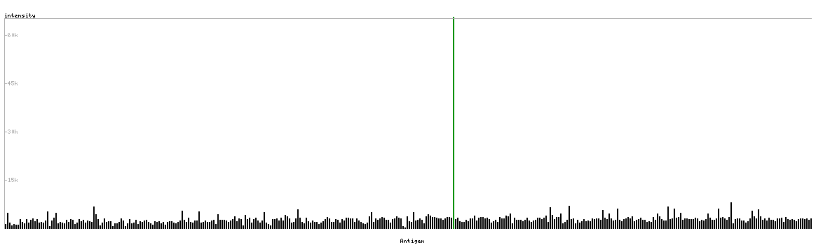 At the top of the view, the position of the antigen (identified by the corresponding HPA identifier) is shown as a green bar. A yellow triangle on the bar indicates a <100% sequence identity to the protein target.