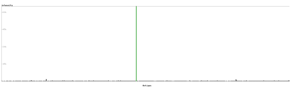 At the top of the view, the position of the antigen (identified by the corresponding HPA identifier) is shown as a green bar. A yellow triangle on the bar indicates a <100% sequence identity to the protein target.