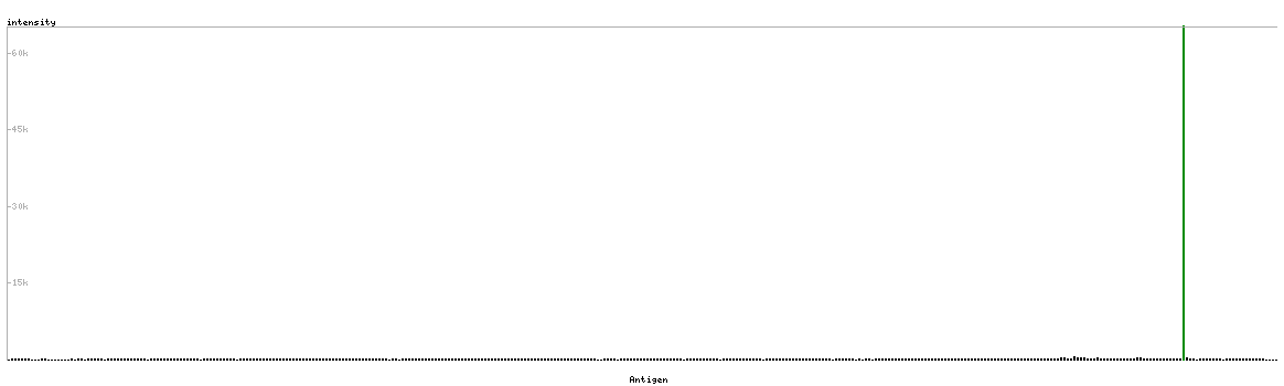At the top of the view, the position of the antigen (identified by the corresponding HPA identifier) is shown as a green bar. A yellow triangle on the bar indicates a <100% sequence identity to the protein target.