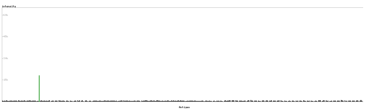 At the top of the view, the position of the antigen (identified by the corresponding HPA identifier) is shown as a green bar. A yellow triangle on the bar indicates a <100% sequence identity to the protein target.