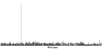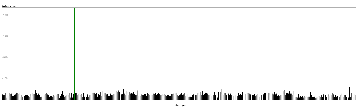 At the top of the view, the position of the antigen (identified by the corresponding HPA identifier) is shown as a green bar. A yellow triangle on the bar indicates a <100% sequence identity to the protein target.