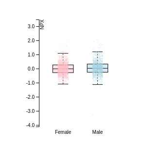 Blood protein levels in 96 healthy adults (aged 50–65) measured at six visits over a two-year period, shown separately for males and females. Relative protein abundances were quantified using the proximity extension assay (PEA) with the Olink Explore HT.