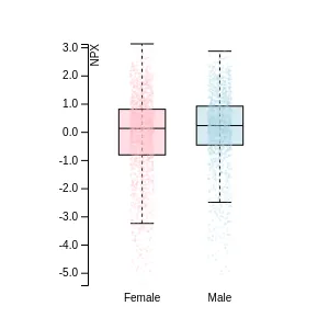 Blood protein levels in 96 healthy adults (aged 50–65) measured at six visits over a two-year period, shown separately for males and females. Relative protein abundances were quantified using the proximity extension assay (PEA) with the Olink Explore HT.