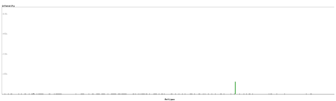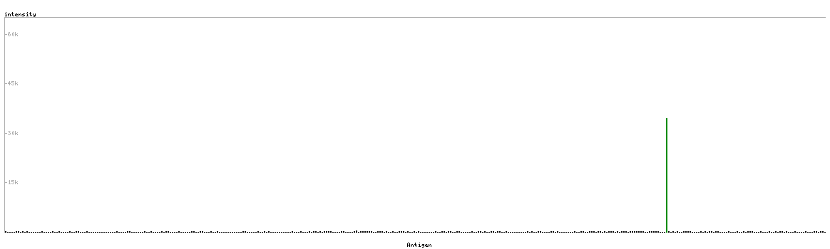 At the top of the view, the position of the antigen (identified by the corresponding HPA identifier) is shown as a green bar. A yellow triangle on the bar indicates a <100% sequence identity to the protein target.