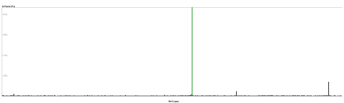 At the top of the view, the position of the antigen (identified by the corresponding HPA identifier) is shown as a green bar. A yellow triangle on the bar indicates a <100% sequence identity to the protein target.