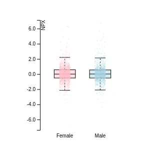 Blood protein levels in 96 healthy adults (aged 50–65) measured at six visits over a two-year period, shown separately for males and females. Relative protein abundances were quantified using the proximity extension assay (PEA) with the Olink Explore HT.