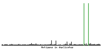 At the top of the view, the position of the antigen (identified by the corresponding HPA identifier) is shown as a green bar. A yellow triangle on the bar indicates a <100% sequence identity to the protein target.