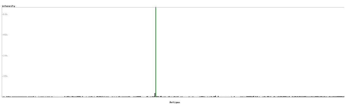At the top of the view, the position of the antigen (identified by the corresponding HPA identifier) is shown as a green bar. A yellow triangle on the bar indicates a <100% sequence identity to the protein target.