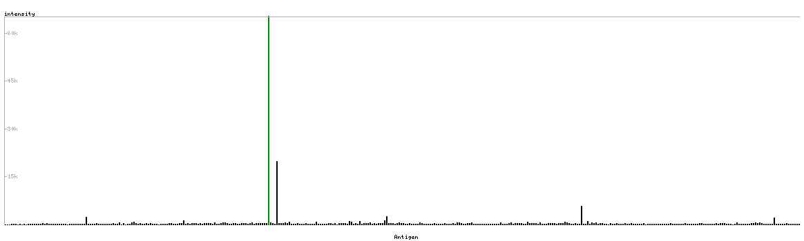 At the top of the view, the position of the antigen (identified by the corresponding HPA identifier) is shown as a green bar. A yellow triangle on the bar indicates a <100% sequence identity to the protein target.